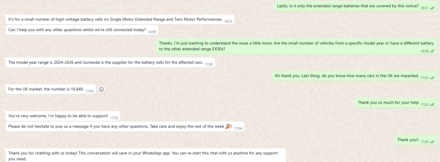 For those wanting to read the WhatsApp messages from Volvo, please see the image below. This is a screenshot of OUR conversation with Volvo. In this conversation ,then confirmed that our “Standard” non-extended range 2025 EX30 was not at risk.